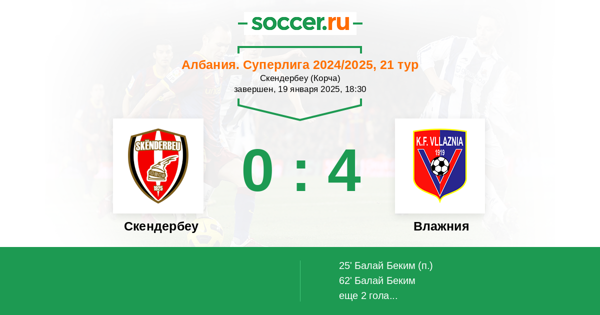 Албания. Суперлига 27.12.2020 Влажния Логотип футбольный клуб Влажния (Шкодер) 5:1 Логотип футбольный клуб Скендербеу (Корча) Скендербеу