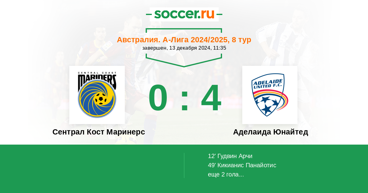 Австралия. А-Лига 04.01.2026 Аделаида Юнайтед Логотип футбольный клуб Аделаида Юнайтед 0:4 Логотип футбольный клуб Сентрал Кост Маринерс Сентрал Кост Маринерс