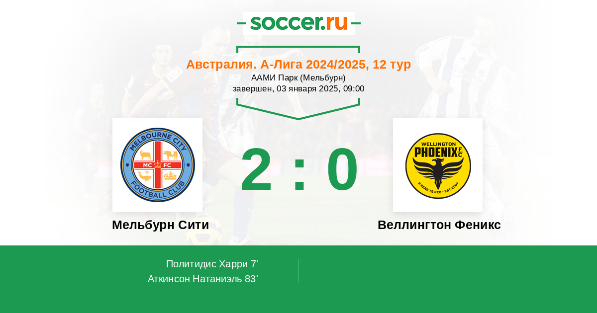 Австралия. А-Лига 28.02.2025 Веллингтон Феникс Логотип футбольный клуб Веллингтон Феникс 0:1 Логотип футбольный клуб Мельбурн Сити Мельбурн Сити