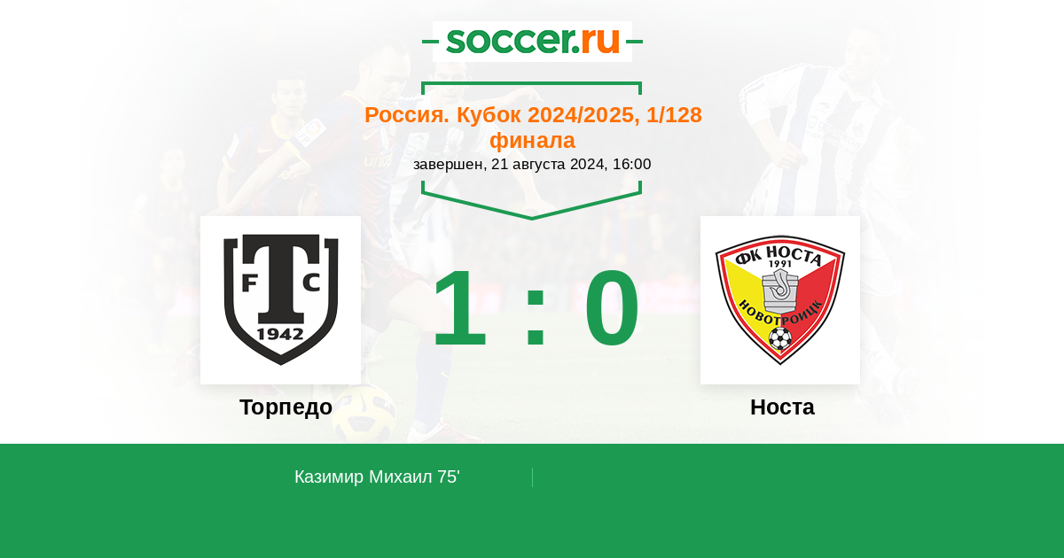 Россия. Кубок 14.07.2021 Носта Логотип футбольный клуб Носта (Новотроицк) 1:3 Логотип футбольный клуб Торпедо (Миасс) Торпедо