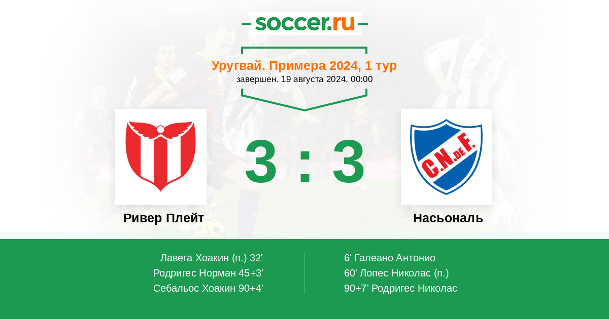 Уругвай. Примера A 24.10.2019 Ривер Плейт Логотип футбольный клуб Ривер Плейт (Монтевидео) 3:1 Логотип футбольный клуб Насьональ (Монтевидео) Насьональ