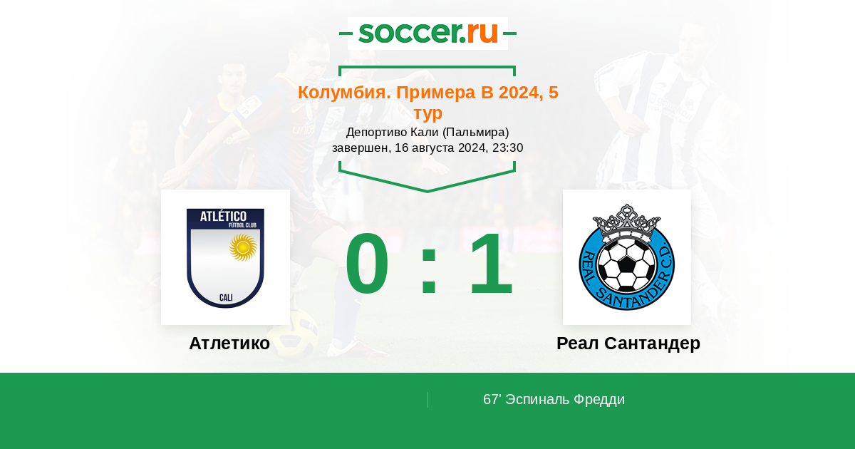 Колумбия. Примера B 18.08.2014 Атлетико Кали Логотип футбольный клуб Атлетико Кали 2:1 Логотип футбольный клуб Реал Сантандер (Букараманга) Реал Сантандер