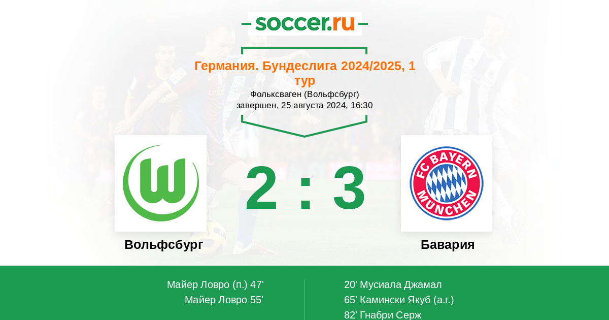 Германия. Бундеслига 18.01.2025 Бавария Логотип футбольный клуб Бавария (Мюнхен) 3:2 Логотип футбольный клуб Вольфсбург Вольфсбург