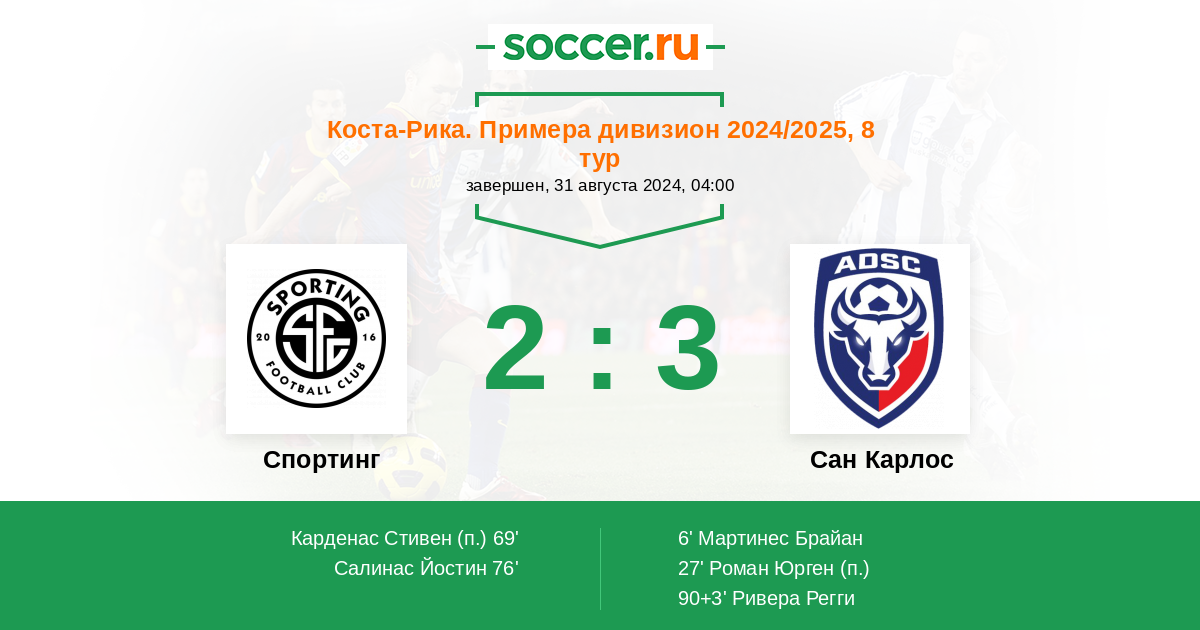 Коста-Рика. Примера дивизион 04.09.2020 Спортинг Сан-Хосе Логотип футбольный клуб Спортинг Сан-Хосе 1:0 Логотип футбольный клуб Сан Карлос (Сьюдад Куэсада) Сан Карлос
