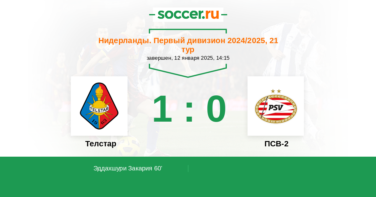 Нидерланды. Первый дивизион 19.12.2014 ПСВ-2 Логотип футбольный клуб ПСВ-2 (Эйндховен) 1:1 Логотип футбольный клуб Телстар (Велсен-Зёйд) Телстар