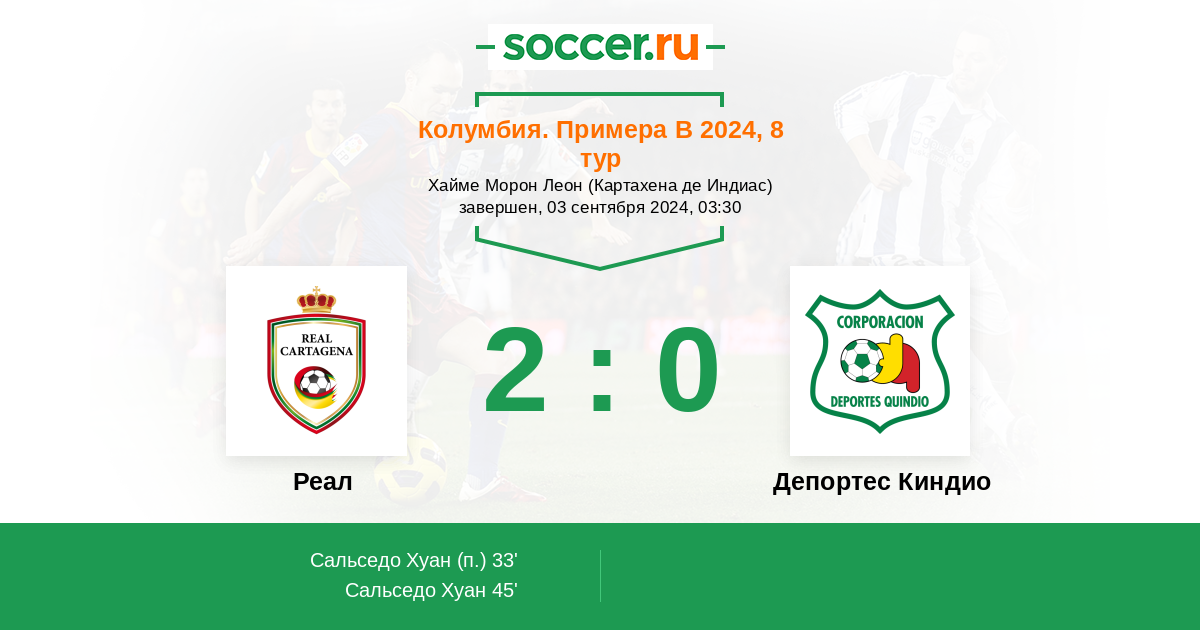 Колумбия. Примера B 24.09.2023 Реал Логотип футбольный клуб Реал (Картахена) 2:0 Логотип футбольный клуб Депортес Киндио (Армения) Депортес Киндио