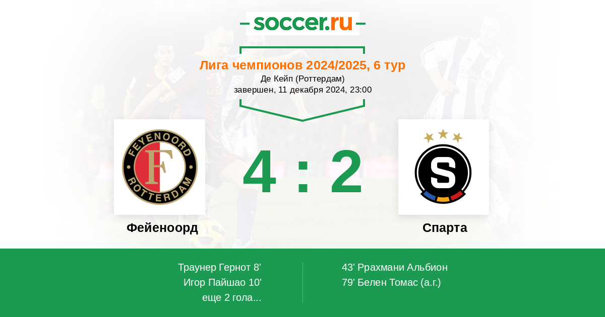 Фейеноорд - Спарта ! Слишком мотивированны выйдут хозяева на этот матч . Ведь они даже не попадают во второй " пул " Жду от них голы . ИТБ 1 (2) .