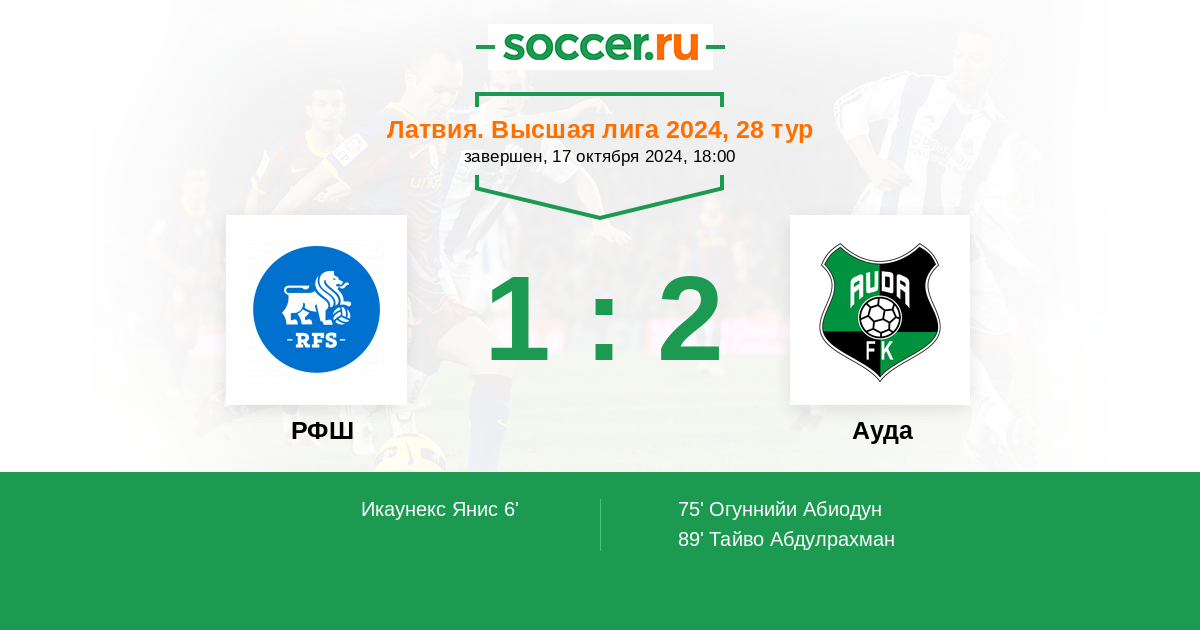Латвия. Высшая лига 01.05.2024 РФШ Логотип футбольный клуб РФШ (Рига) 2:1 Логотип Ауда (Кекава) Ауда