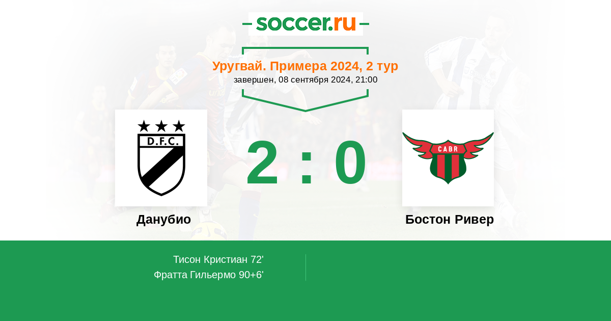 Уругвай. Примера A 15.02.2026 Данубио Логотип футбольный клуб Данубио (Монтевидео) 2:0 Логотип футбольный клуб Бостон Ривер (Монтевидео) Бостон Ривер