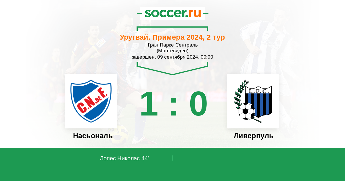Уругвай. Примера A 15.06.2024 Насьональ Логотип футбольный клуб Насьональ (Монтевидео) 2:1 Логотип футбольный клуб Ливерпуль (Монтевидео) Ливерпуль