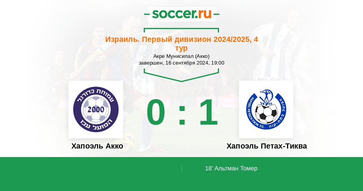 Израиль. Первый дивизион 01.11.2021 Хапоэль Акко Логотип футбольный клуб Хапоэль Акко 1:0 Логотип футбольный клуб Хапоэль Петах-Тиква Хапоэль Петах-Тиква