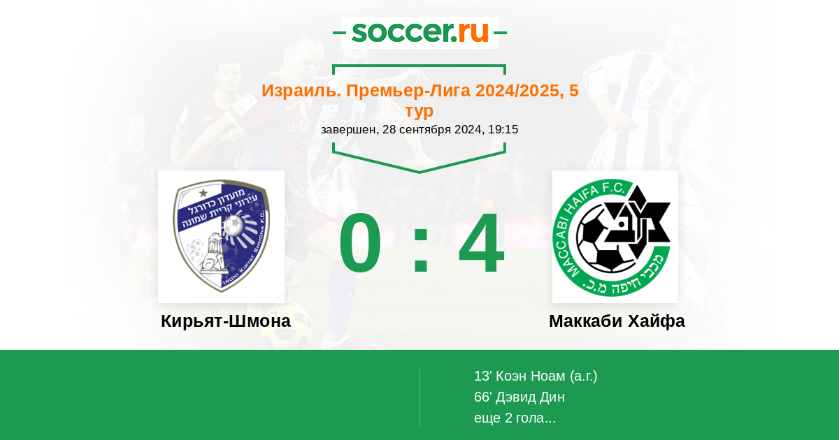 Израиль. Премьер-Лига 17.04.2021 Маккаби Хайфа Логотип футбольный клуб Маккаби Хайфа 4:0 Логотип футбольный клуб Кирьят-Шмона Кирьят-Шмона