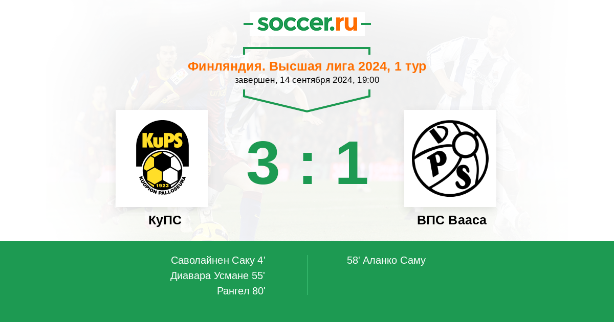 Финляндия. Высшая лига 11.06.2014 ВПС Вааса Логотип футбольный клуб ВПС Вааса 0:3 Логотип футбольный клуб КуПС (Купио) КуПС