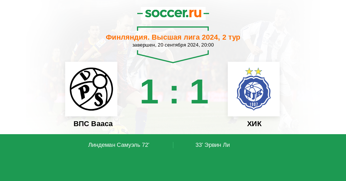 Финляндия. Высшая лига 01.09.2024 ВПС Вааса Логотип футбольный клуб ВПС Вааса 1:3 Логотип футбольный клуб ХИК (Хельсинки) ХИК