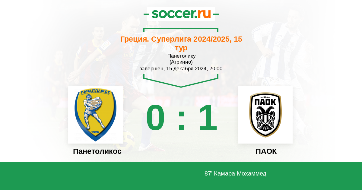 Греция. Суперлига 22.12.2022 Панетоликос Логотип футбольный клуб Панетоликос (Агринио) 0:2 Логотип футбольный клуб ПАОК (Салоники) ПАОК