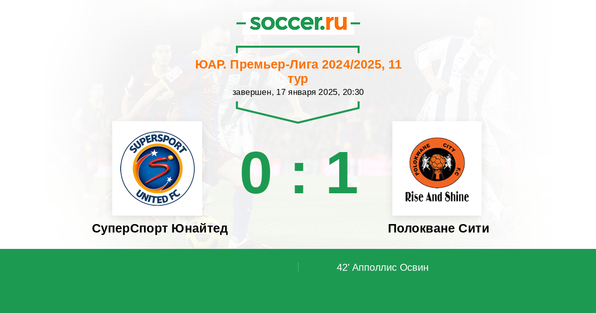 ЮАР. Премьер-Лига 23.01.2018 СуперСпорт Юнайтед Логотип футбольный клуб СуперСпорт Юнайтед (Претория) 1:1 Логотип футбольный клуб Полокване Сити Полокване Сити