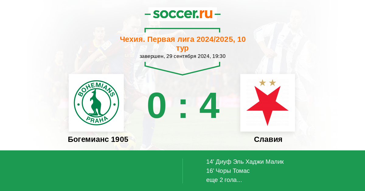 Чехия. Первая Лига 20.09.2014 Богемианс 1905 Логотип футбольный клуб Богемианс 1905 (Прага) 2:0 Логотип футбольный клуб Славия (Прага) Славия