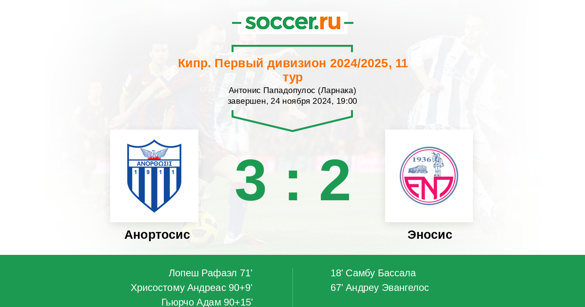 Кипр. Первый Дивизион 23.11.2025 Эносис Логотип футбольный клуб Эносис (Паралимни) 2:3 Логотип футбольный клуб Анортосис (Ларнака) Анортосис