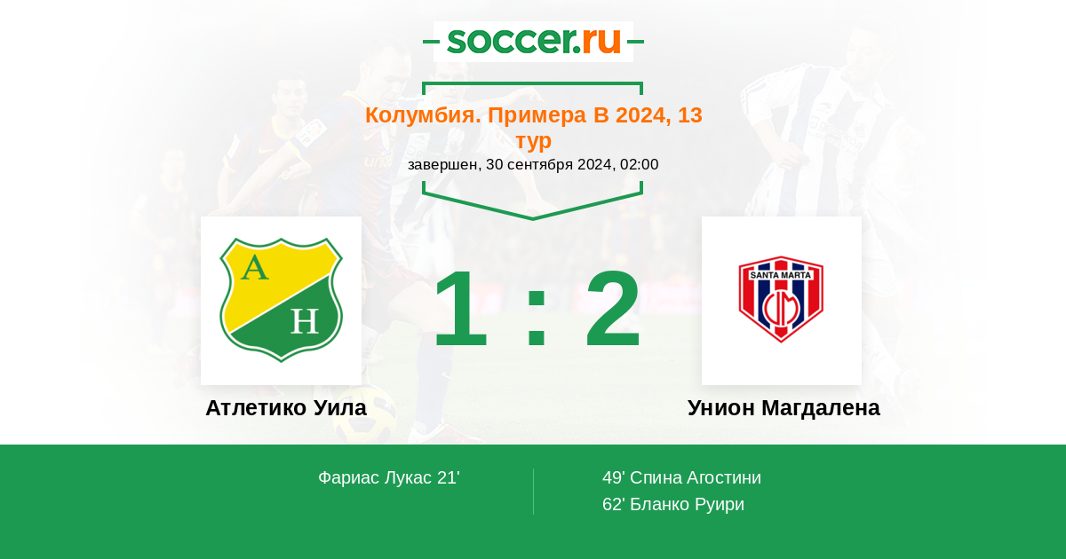 Колумбия. Примера B 08.12.2020 Атлетико Уила Логотип футбольный клуб Атлетико Уила (Нейва) 2:1 Логотип футбольный клуб Унион Магдалена (Санта Марта) Унион Магдалена