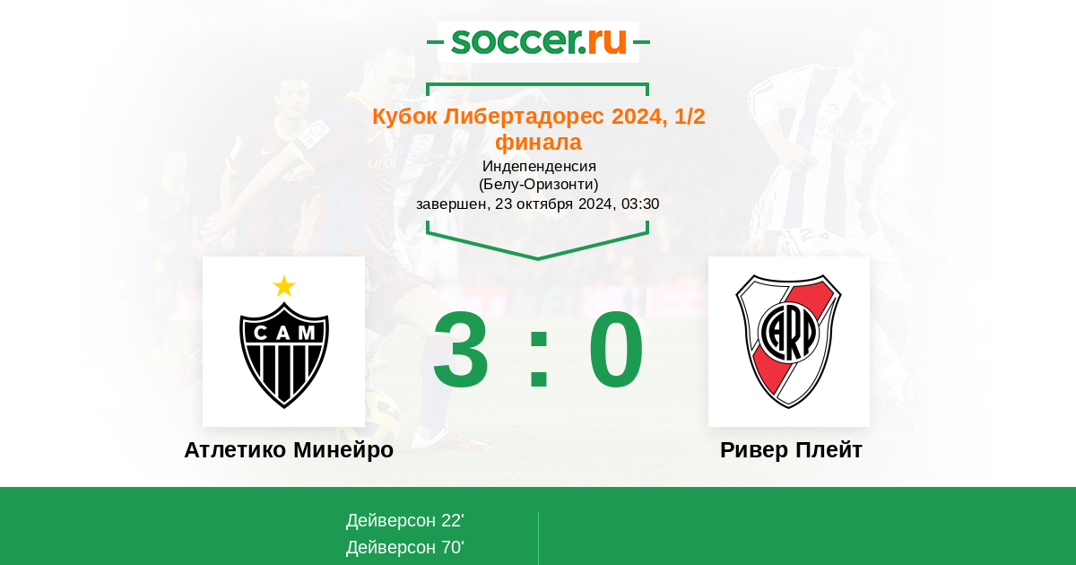 Атлетико Минейро - Ривер Плейт ! Поединок должен быть весьма напряжённым , всё таки первый полуфинальный матч . Вряд ли команды захотят уступать . Если одни забьют , вторые побегут отыгрываться . ОЗ .