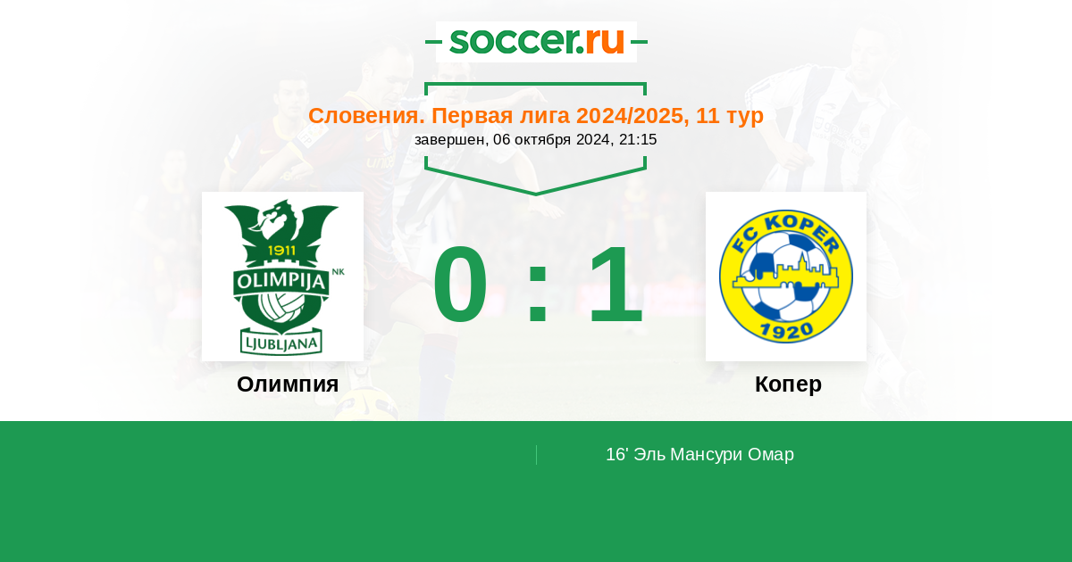 Словения. Кубок 27.10.2021 Олимпия Логотип футбольный клуб Олимпия (Любляна) 0:1 Логотип футбольный клуб Копер Копер