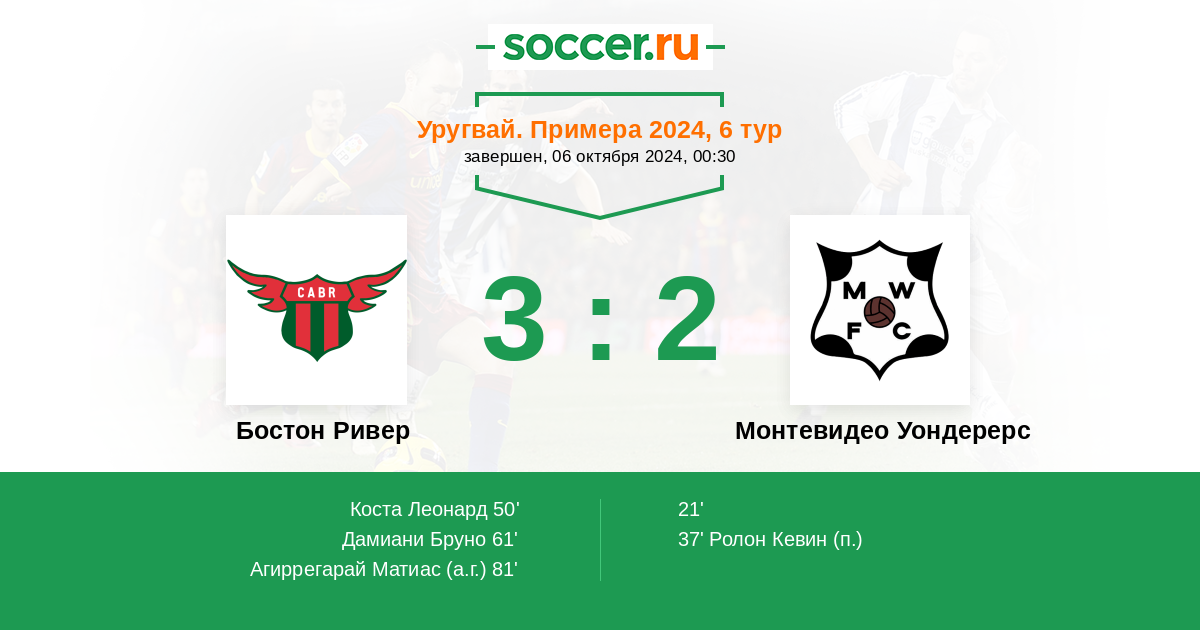 Уругвай. Примера A 01.04.2024 Монтевидео Уондерерс Логотип футбольный клуб Монтевидео Уондерерс 0:2 Логотип футбольный клуб Бостон Ривер (Монтевидео) Бостон Ривер