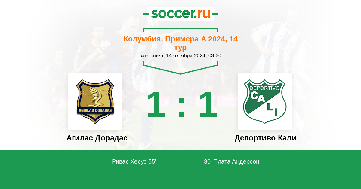 Колумбия. Примера А 13.10.2022 Агилас Дорадас Логотип футбольный клуб Агилас Дорадас (Рионегро) 2:2 Логотип футбольный клуб Депортиво Кали Депортиво Кали