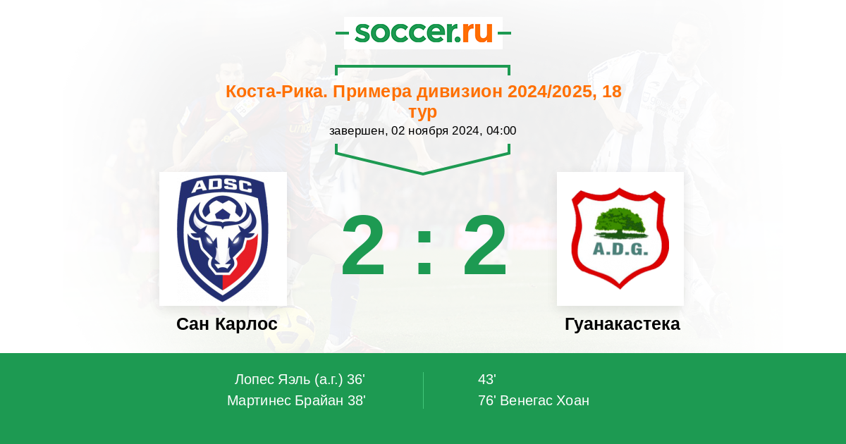 Коста-Рика. Второй дивизион 25.03.2018 Гуанакастека Логотип футбольный клуб Гуанакастека (Никойя) 1:2 Логотип футбольный клуб Сан Карлос (Сьюдад Куэсада) Сан Карлос