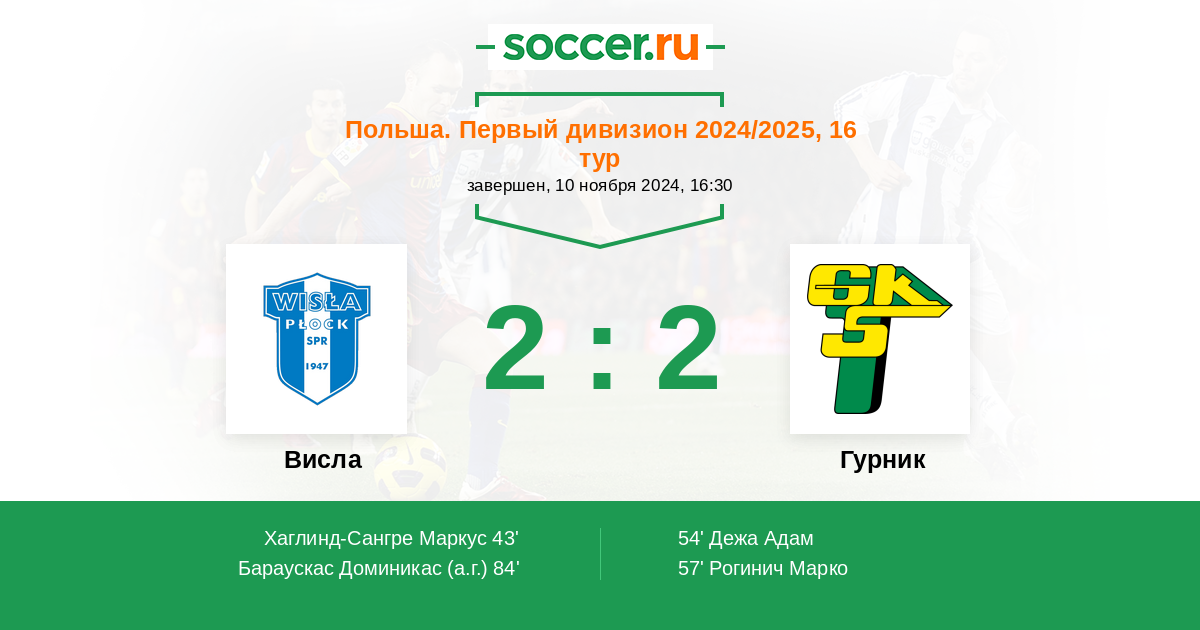 Польша. Первый дивизион 17.05.2025 Гурник Логотип футбольный клуб Гурник (Ленчна) 2:2 Логотип футбольный клуб Висла (Плоцк) Висла