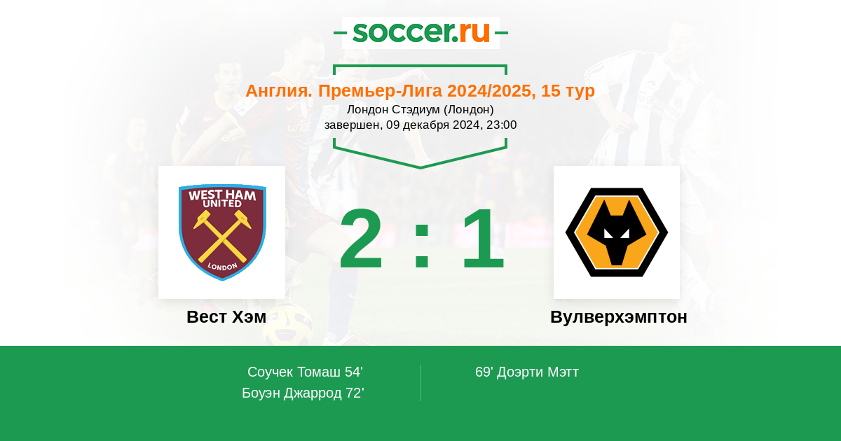 Англия. Премьер-Лига 17.12.2023 Вест Хэм Логотип футбольный клуб Вест Хэм (Лондон) 3:0 Логотип футбольный клуб Вулверхэмптон Вулверхэмптон