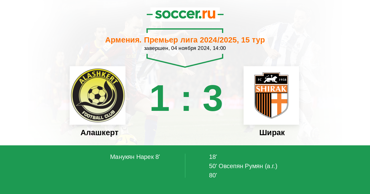 Армения. Премьер-лига 09.11.2014 Ширак Логотип футбольный клуб Ширак (Гюмри) 1:1 Логотип футбольный клуб Алашкерт (Мартуни) Алашкерт