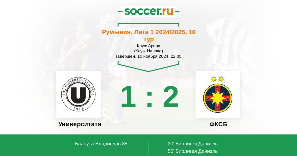 Румыния. Лига 1 05.04.2025 ФКСБ Логотип футбольный клуб ФКСБ (Бухарест) 1:0 Логотип футбольный клуб Университатя Клуж Университатя Клуж