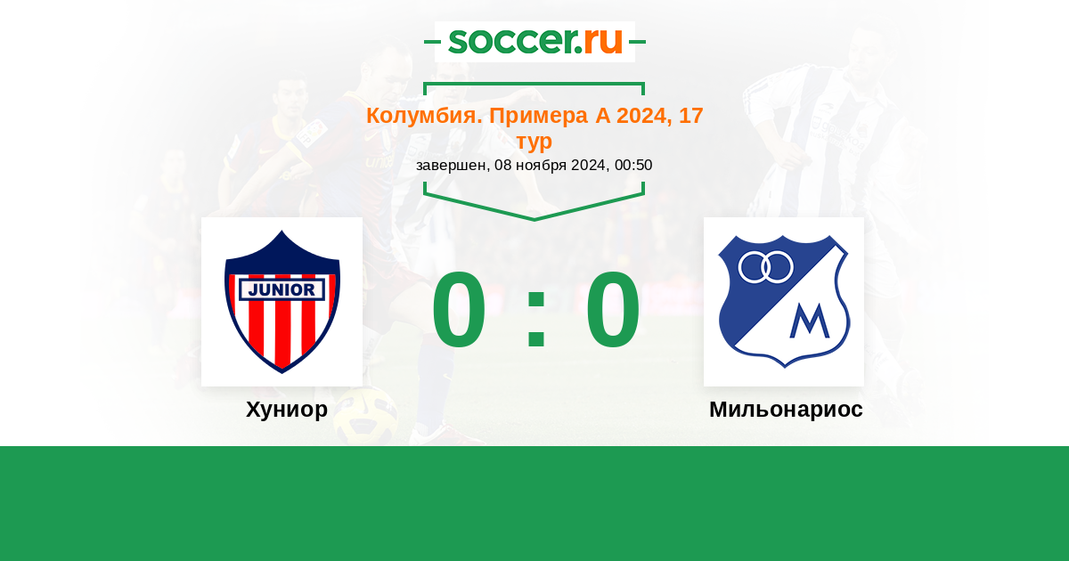 Колумбия. Примера А 26.01.2026 Мильонариос Логотип футбольный клуб Мильонариос (Богота) 1:2 Логотип футбольный клуб Хуниор (Барранкилья) Хуниор