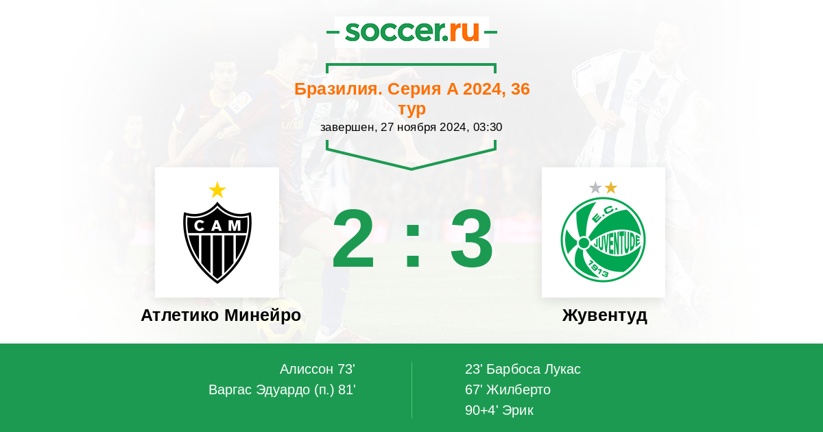 Бразилия. Серия А 21.11.2021 Атлетико Минейро Логотип футбольный клуб Атлетико Минейро (Белу-Оризонти) 2:0 Логотип футбольный клуб Жувентуд (Кашиас-ду-Сул) Жувентуд