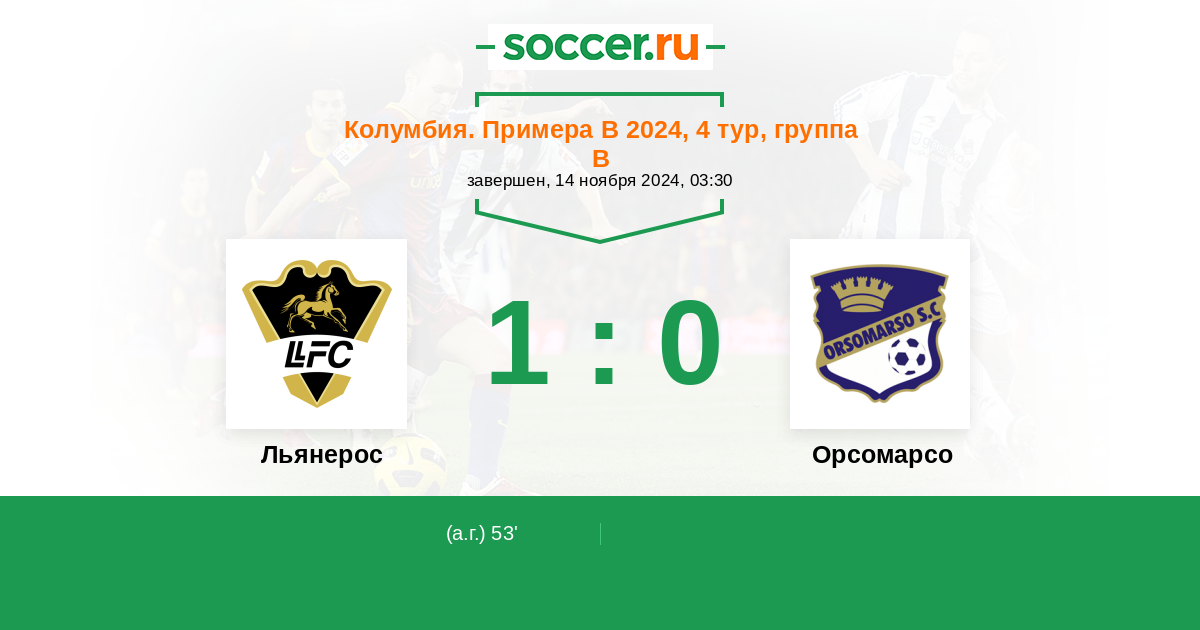 Колумбия. Примера B 20.04.2024 Льянерос Логотип футбольный клуб Льянерос (Вильявисенсио) 1:0 Логотип футбольный клуб Орсомарсо Орсомарсо