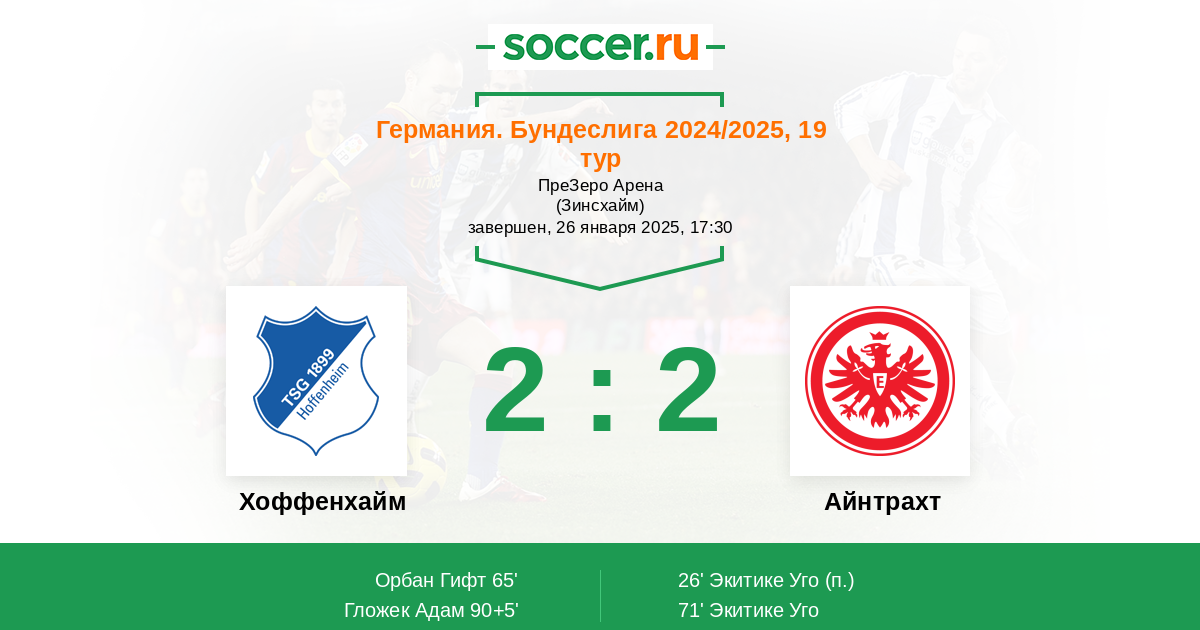 Германия. Бундеслига 24.01.2026 Айнтрахт Логотип футбольный клуб Айнтрахт (Франкфурт) 1:3 Логотип футбольный клуб Хоффенхайм (Зинсхайм) Хоффенхайм
