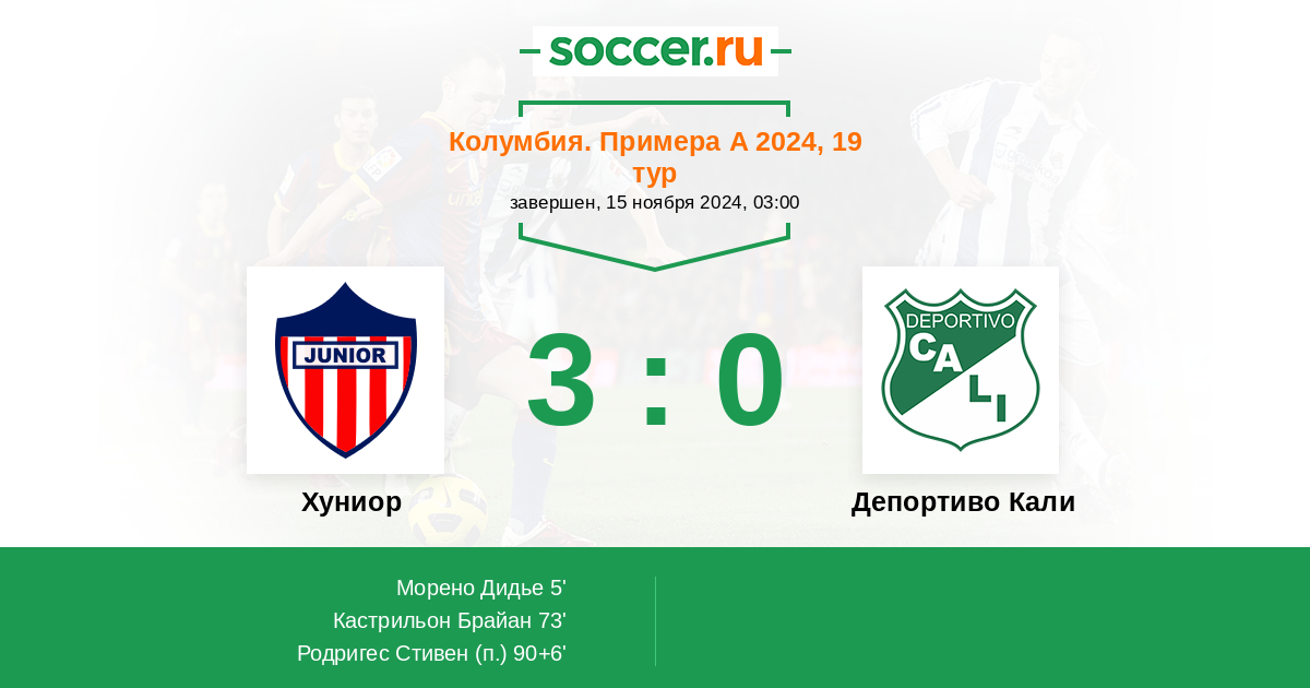 Колумбия. Примера А 19.11.2023 Хуниор Логотип футбольный клуб Хуниор (Барранкилья) 3:0 Логотип футбольный клуб Депортиво Кали Депортиво Кали