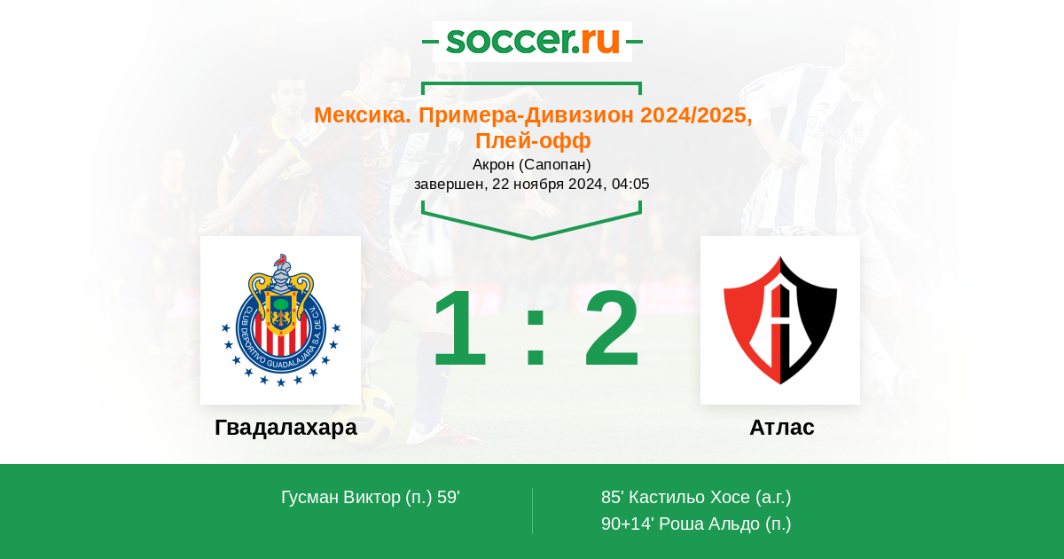 Мексика. Примера-Дивизион 20.04.2025 Атлас Логотип футбольный клуб Атлас (Гвадалахара) 1:1 Логотип футбольный клуб Гвадалахара Гвадалахара