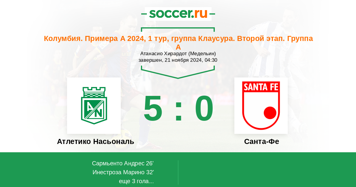 Колумбия. Примера А 26.02.2026 Санта-Фе Логотип футбольный клуб Санта-Фе (Богота) 1:2 Логотип футбольный клуб Атлетико Насьональ (Медельин) Атлетико Насьональ