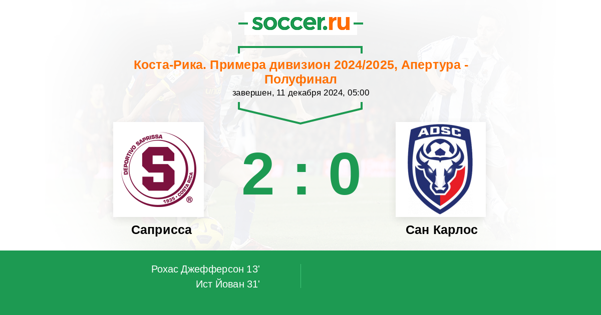 Коста-Рика. Примера дивизион 11.11.2012 Саприсса Логотип футбольный клуб Саприсса (Сан Хосе) 2:1 Логотип футбольный клуб Сан Карлос (Сьюдад Куэсада) Сан Карлос
