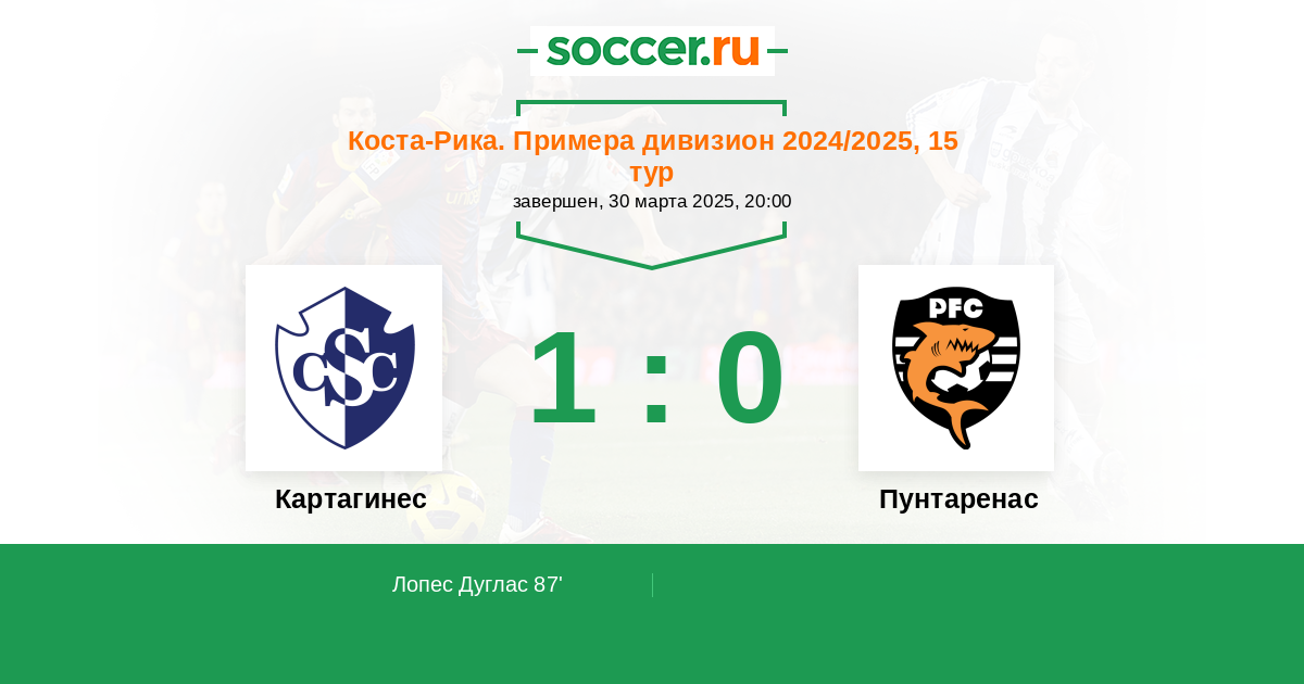 Коста-Рика. Примера дивизион 06.03.2025 Пунтаренас Логотип футбольный клуб Пунтаренас 1:0 Логотип футбольный клуб Картахинес (Карфаген) Картахинес