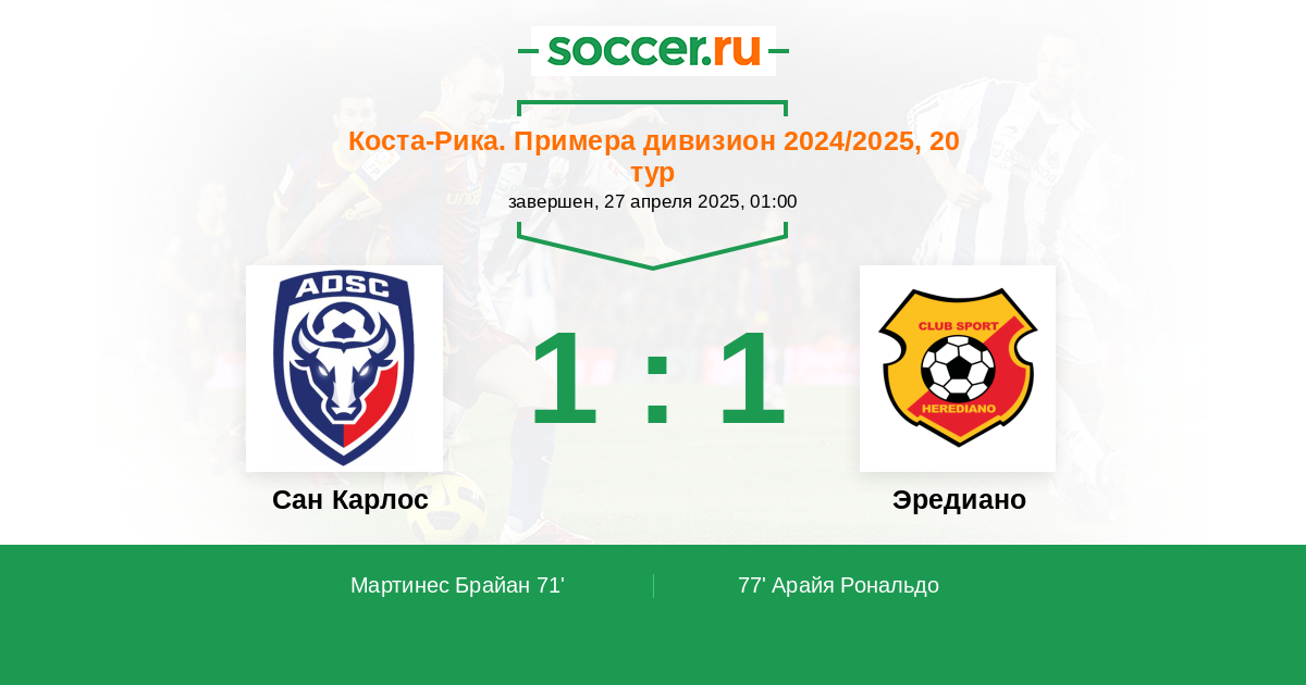 Коста-Рика. Примера дивизион 24.04.2022 Эредиано Логотип футбольный клуб Эредиано 1:1 Логотип футбольный клуб Сан Карлос (Сьюдад Куэсада) Сан Карлос