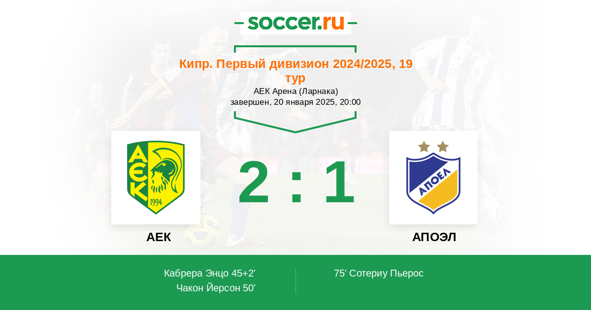 Кипр. Первый Дивизион 21.01.2018 АПОЭЛ Логотип футбольный клуб АПОЭЛ (Никосия) 3:1 Логотип футбольный клуб АЕК (Ларнака) АЕК