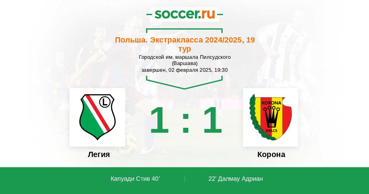 Польша. Экстракласса 22.07.2017 Легия Логотип футбольный клуб Легия (Варшава) 1:1 Логотип футбольный клуб Корона (Кельце) Корона