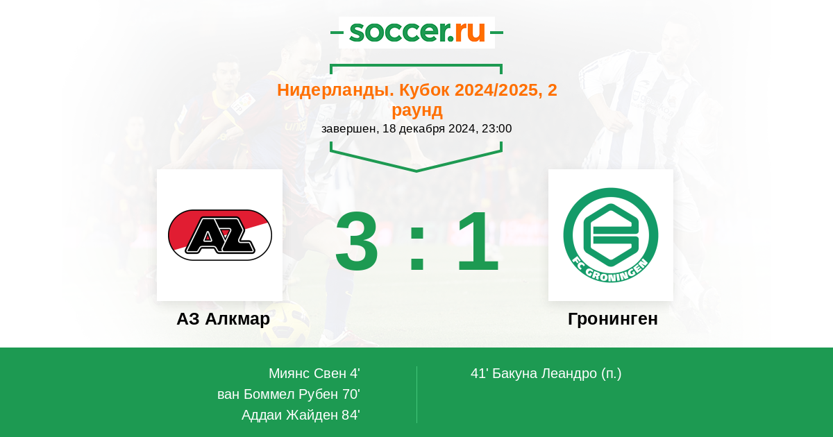 Нидерланды. Эредивизи 25.08.2024 Гронинген Логотип футбольный клуб Гронинген 0:0 Логотип футбольный клуб АЗ Алкмар АЗ Алкмар