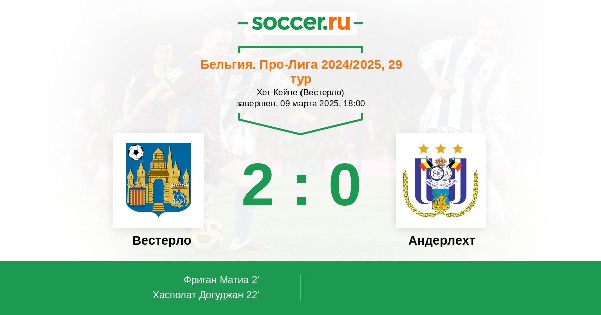 Бельгия. Про-Лига 11.12.2009 Вестерло Логотип футбольный клуб Вестерло 0:2 Логотип футбольный клуб Андерлехт (Брюссель) Андерлехт
