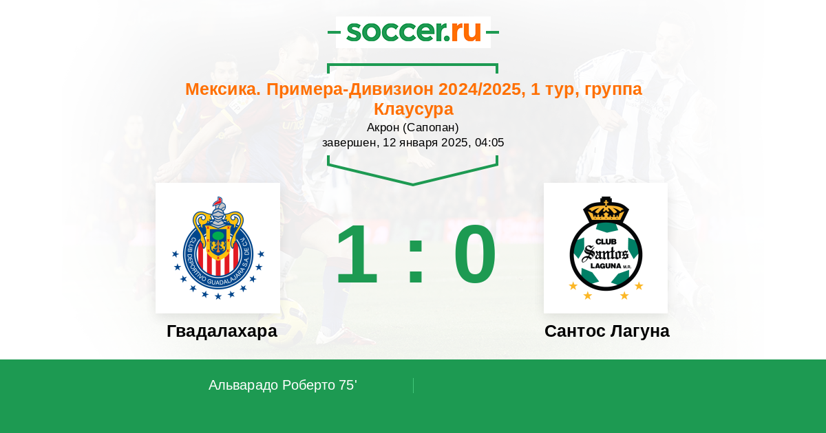 Мексика. Примера-Дивизион 14.01.2024 Гвадалахара Логотип футбольный клуб Гвадалахара 1:1 Логотип футбольный клуб Сантос Лагуна (Торреон) Сантос Лагуна