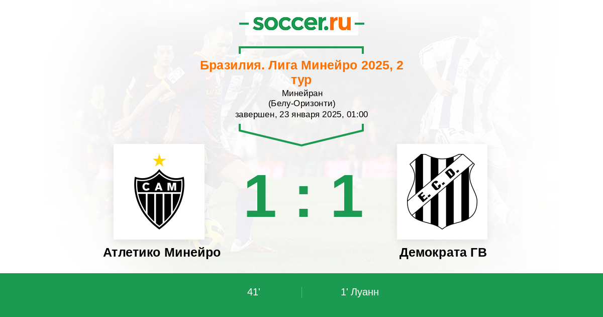 Бразилия. Лига Минейро 04.03.2023 Демократа ГВ Логотип футбольный клуб Демократа ГВ (Говернадор-Валадарис) 0:3 Логотип футбольный клуб Атлетико Минейро (Белу-Оризонти) Атлетико Минейро