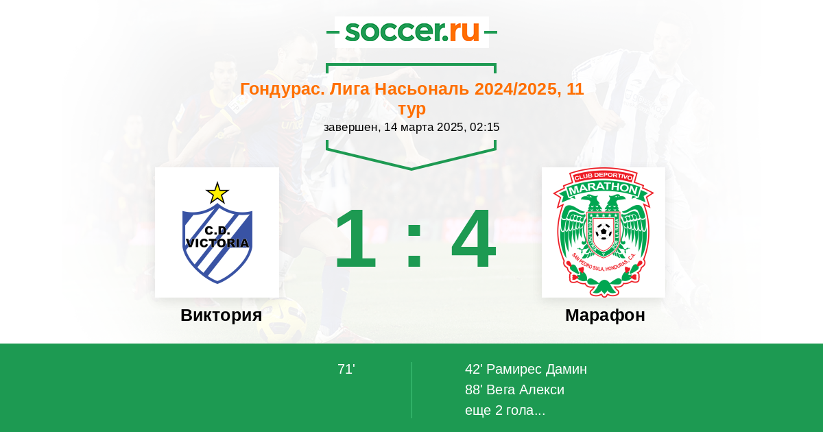 Гондурас. Лига Насьональ 19.03.2014 Марафон Логотип футбольный клуб Марафон (Сан-Педро-Сула) 2:0 Логотип футбольный клуб Виктория (Ла-Сейба) Виктория