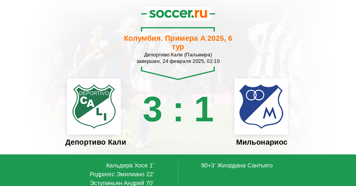Колумбия. Примера А 05.03.2023 Мильонариос Логотип футбольный клуб Мильонариос (Богота) 2:0 Логотип футбольный клуб Депортиво Кали Депортиво Кали